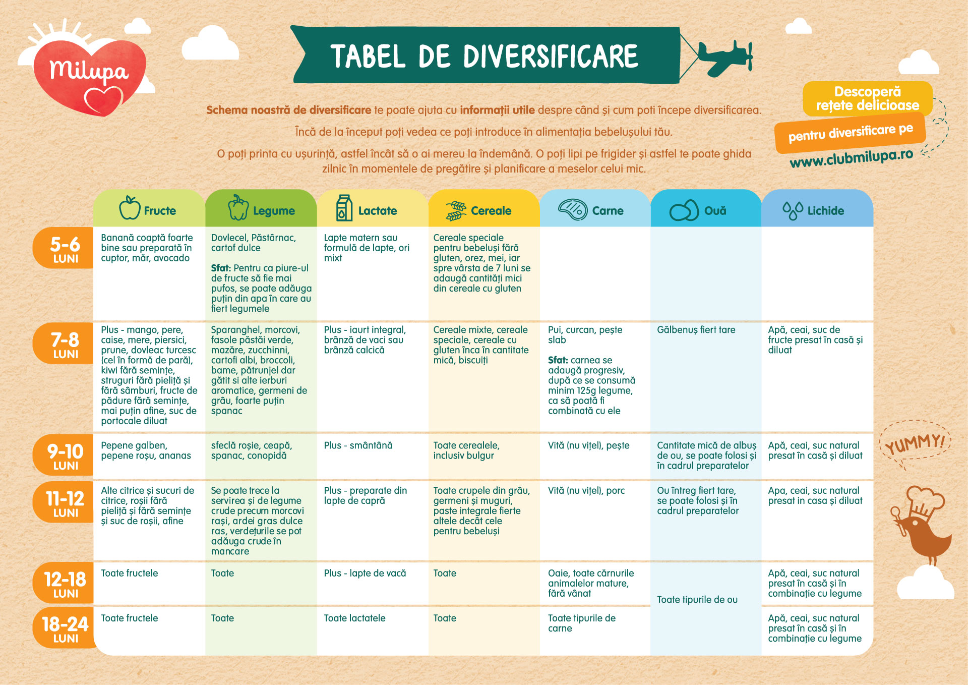 Acest tabel de diversificare a alimentație la bebeluși are un caracter orientativ.